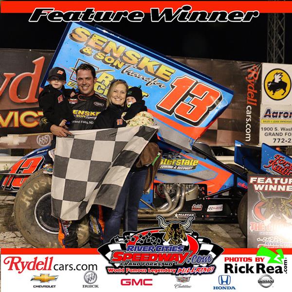 Thirst can only describe Mark Dobmeier's run at River Cities on Friday. On lap 15, Dobmeier threw a slide job in turn one to take the lead then amassed a full straightaway lead in the Senske & Son #13. Standing in victory lane the EAGLE driver commented - "It's absolutely exhausting," he remarked about racing on the rough track. "The car is bouncing all over the place and you only have control about half the time. By the end of it you need a beer." Drink up fella, you earned it!